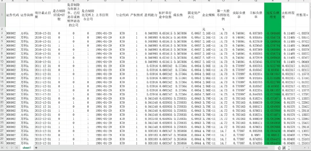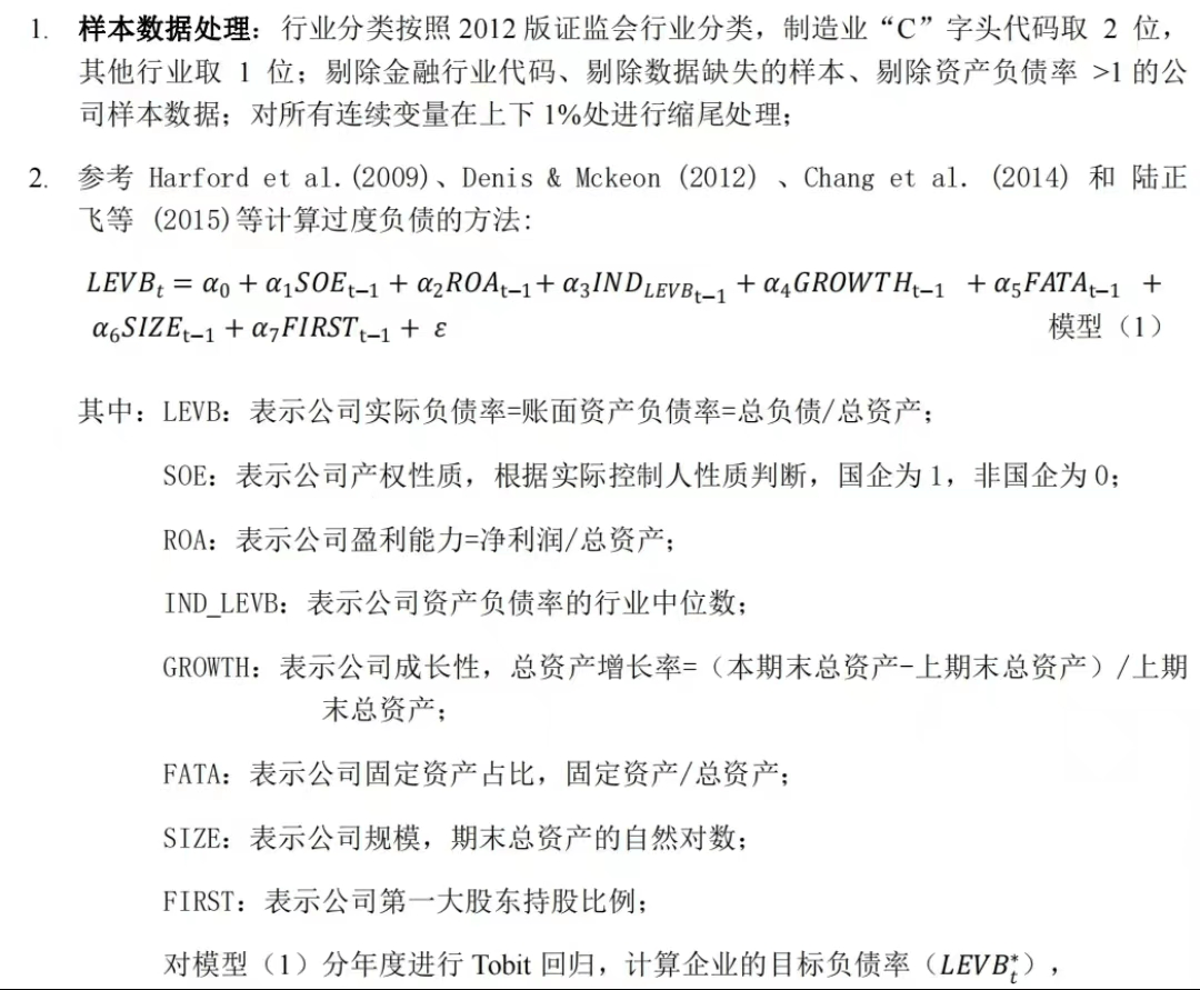 指标:证券代码 证券简称 统计截止日期 是否剔除ST或*ST股 是否剔除当年新上市、已经退市或被暂停退市的公司 是否剔除北交所上市公司 上市日期 行业代码 产权性质 盈利能力 杠杆率行业中位数 成长性 固定资产占比 企业规模(元) 第一大股东持股比例(%) 实际负债率 目标负债率 过度负债程度 去杠杆程度 常数项α0 系数α1 系数α2 系数α3 系数α4 系数α5 系数α6 系数α7 残差ε