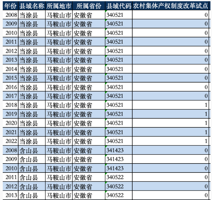 参考《中国农村经济》彭凌志(2024)老师的做法,县(市、区)当年是农村集体产权制度改革试点,取值为1,否则取值为 0