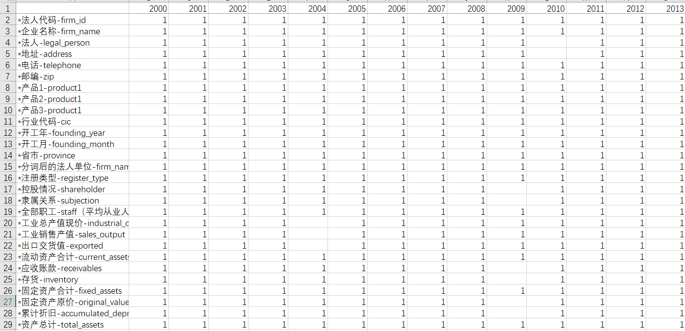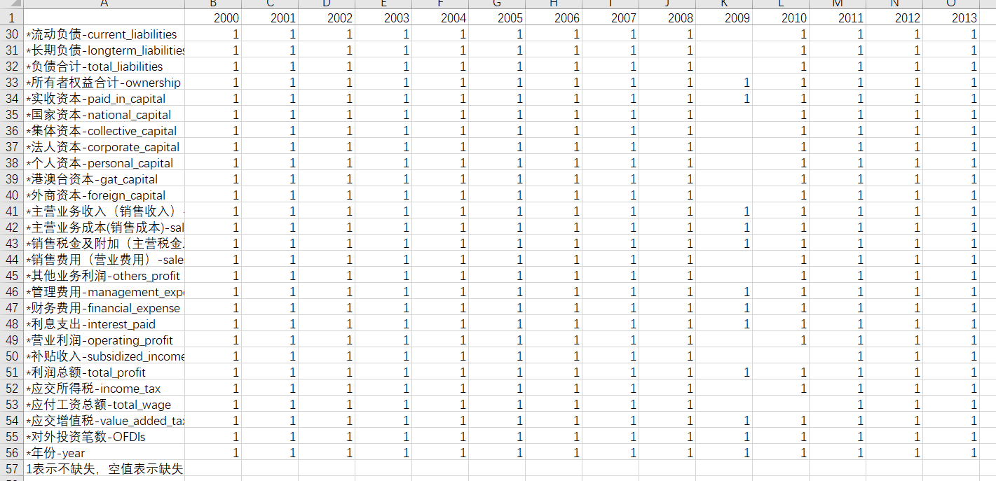 5.数据变量除了OFDIs之外,其他均来自于工业企业数据库,在一定程度上选取了2000年-2013年各年数据库字段的交集,即14年出现了12次以上的变量(这样做是因为即使缺失也可以通过插值补全),如果某个变量仅出现过个位次,则无法补全缺失值,无法使用该指标的面板数据。