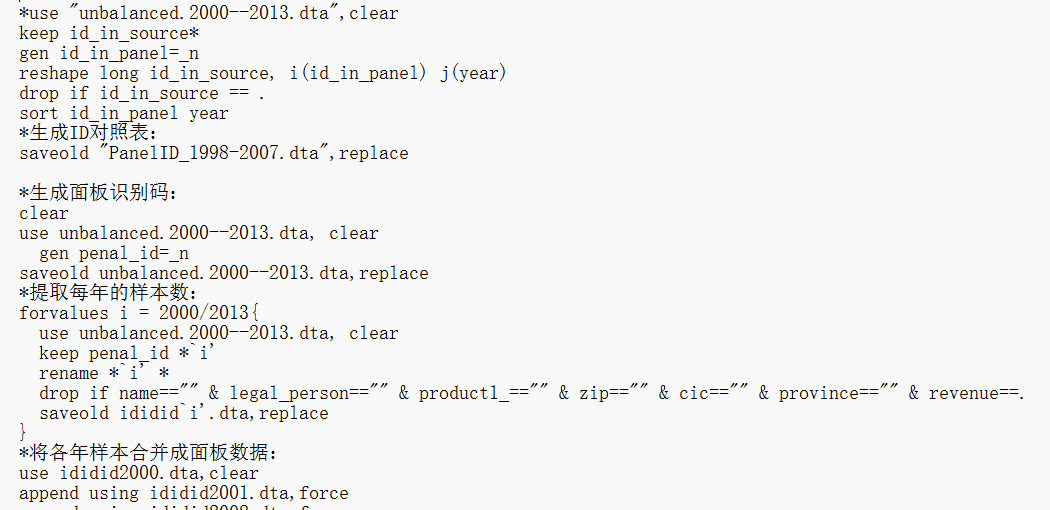 stata代码包括分年合并,非平衡面板处理,删除离群数据等。