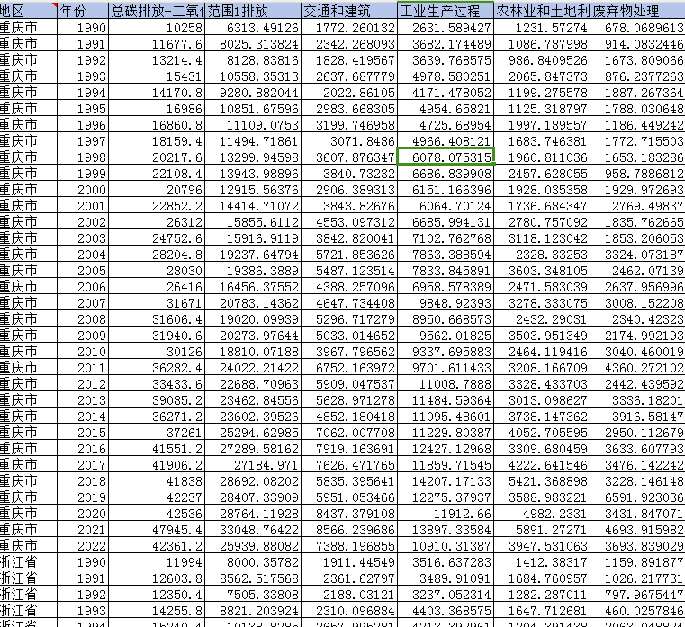 地区、年份、总碳排放-二氧化碳(万吨)、范围1排放、交通和建筑、工业生产过程、农林业和土地利用变化、废弃物处理、范围2排放、外购电力、供热和制冷、范围3排放。