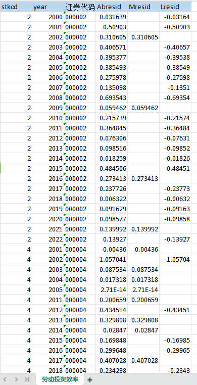证券代码、年份、Abresid(劳动投资效率)、Mresid(冗余雇佣)、Lresid(雇佣不足)。