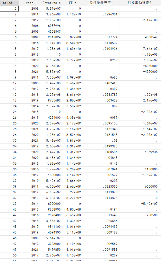 证券代码、年份、O_s、R_s、是否股票期权、是否限制性股票、V_s、较长激励期限、Grtstkta_s、EE_s、股权激励强度1、股权激励强度2、var7、是否实施股权激励、var4、var5。