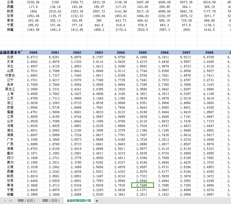 本数据包括各省金融机构存款余额、贷款余额和GDP三个原始指标,金融发展水平=金融机构存贷款余额/GDP。