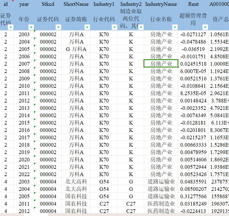 证券代码、年份、证券代码、证券简称、行业代码、制造业取两位代码,其他行业用大类、行业名称、超额管理费用、资产总计、负债合计、董事会规模、员工人数、营业收入、营业成本、管理费用、公司经由四大(普华永道、德勤、毕马威、安永)审计为1,否则为0。 公司前5位大股东持股比例的平方和、股票代码、沪深A股为1,否则为0、北京A股为1,否则为0、Listedyear、Mgtexp、lnsale、Lev、Growth、Board、Staff、Age、Magin、行业代码等等