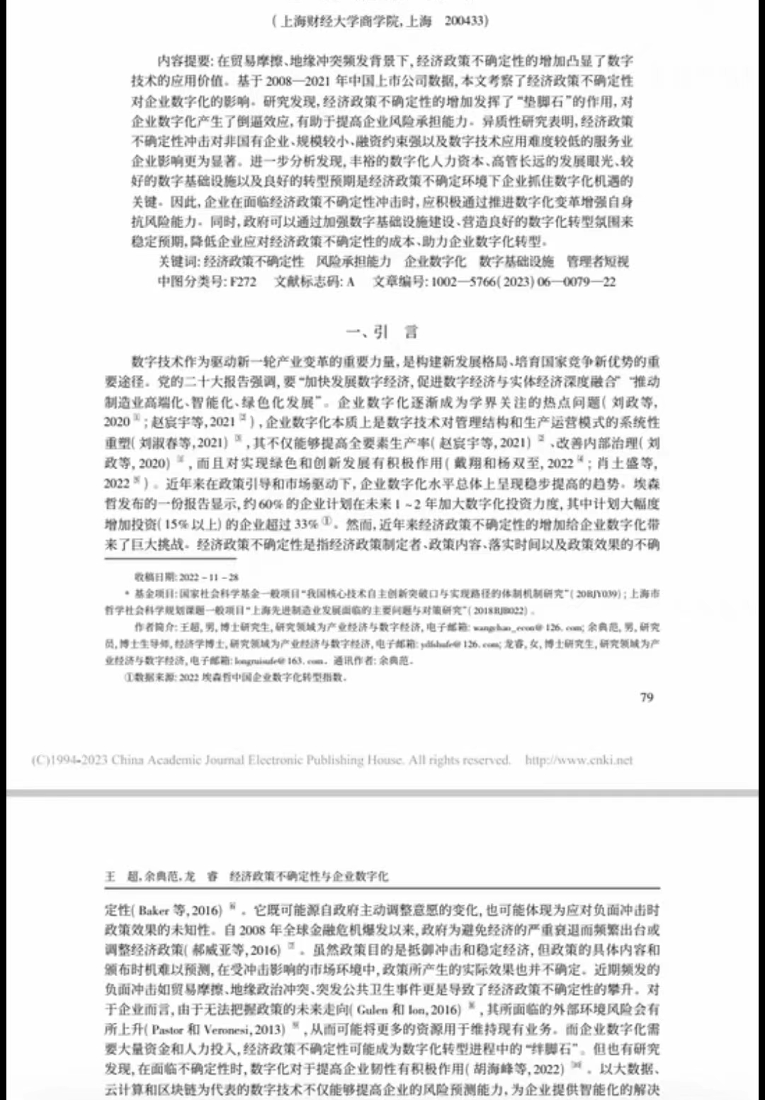 王超,余典范,龙睿.经济政策不确定性与企业数字化——垫脚石还是绊脚石?[J].经济管理,2023,45(06):79-100