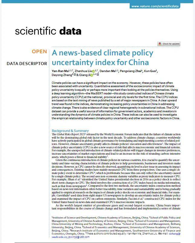 Yan-Ran Ma, Zhenhua Liu, Dandan Ma, Pengxiang Zhai, Kun Guo, Dayong Zhang*, Qiang Ji*. (2023). A news-based climate policy uncertainty index for China. Scientific Data, 10(1), 881.