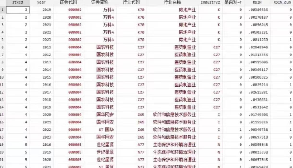 (1)参考《科研管理》万源星(2020)老师的做法,研发操纵属于一种负向的真实盈余管理行为,则定义为异常研发费用增加,即 Abnor-mal_R&D 大于 0 时 Bper 赋值为 1,否则为 0.具体指标包括证券简称 行业代码 行业名称 是否发生ST或ST或PT 研发操纵 研发操纵虚拟变量