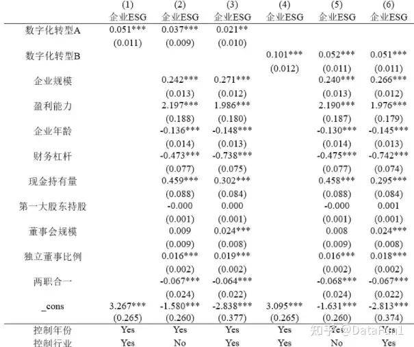 参照王运陈(2023)的做法,对来自证券市场导报《数字化转型能提升企业ESG表现吗——基于合法性理论与信息不对称理论的研究》一文中的基准回归部分进行复刻。本文基于合法性理论和信息不对称理论,以2009-2022年沪深A股上市公司为样本,采用Python爬虫技术识别企业数字化转型程度,并考察其对企业ESG表现的影响及影响渠道。实证结果表明,数字化转型能有效提升企业的ESG表现。