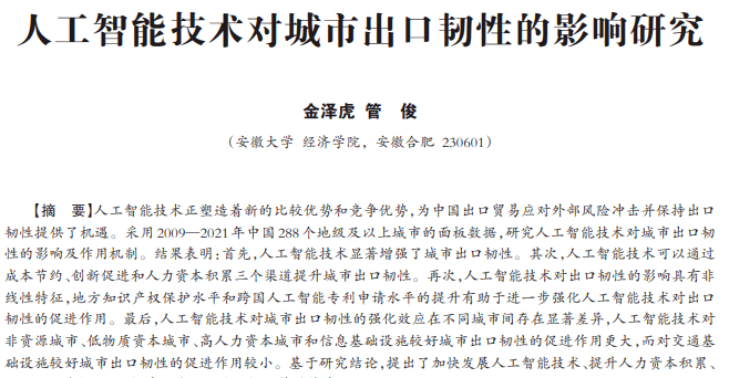 [1]金泽虎,管俊.人工智能技术对城市出口韧性的影响研究[J].价格月刊,2024,(08):57-68.
