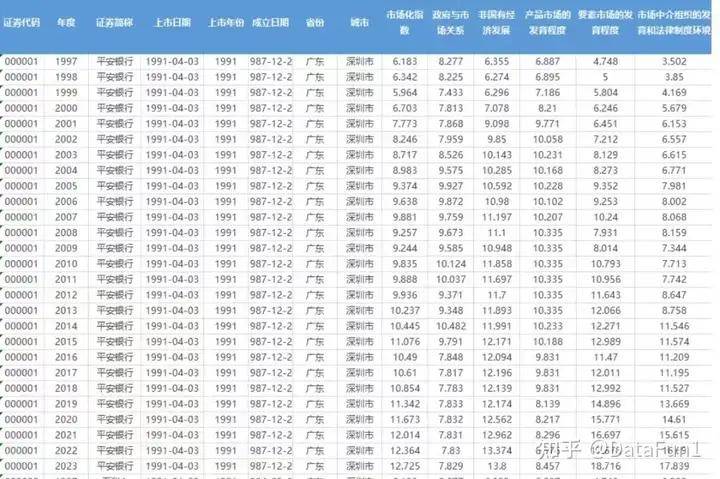 证券代码、年度、证券简称、上市日期、上市年份、成立日期 省份、城市、市场化指数、政府与市场关系、非国有经济发展、产品市场的发育程度、要素市场的发育程度、市场中介组织的发育和法律制度环境参考
