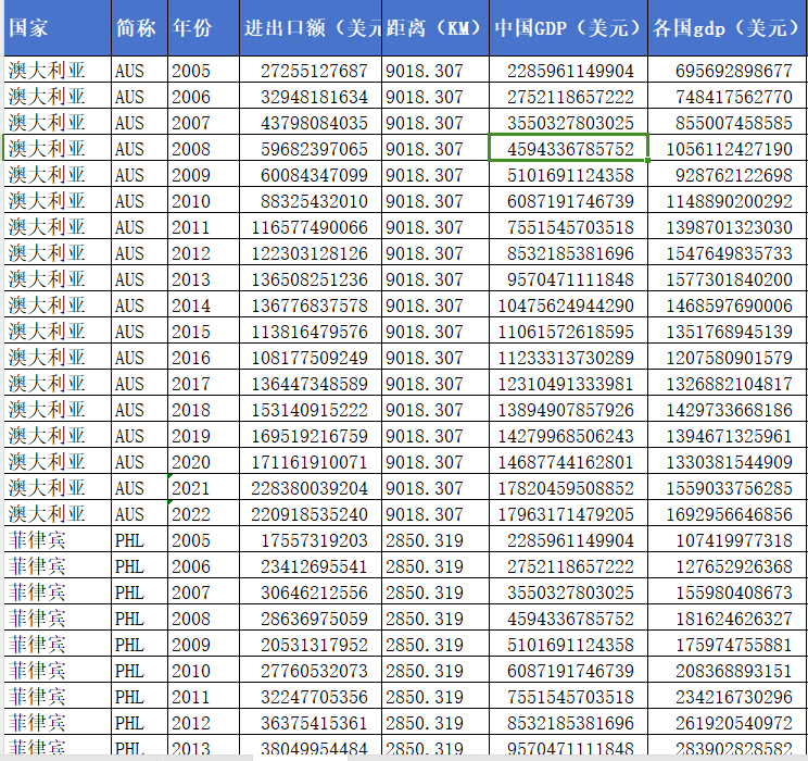 指标:国家 简称 年份 进出口额(美元) 距离(KM) 中国GDP(美元) 各国gdp(美元) 中国人口 各国人口 人民币对美元汇率 进出口额ln 距离ln 中国lnGDP 各国gdpln 中国人口ln 各国人口ln 人民币对美元汇率ln 共同边界 共同语言