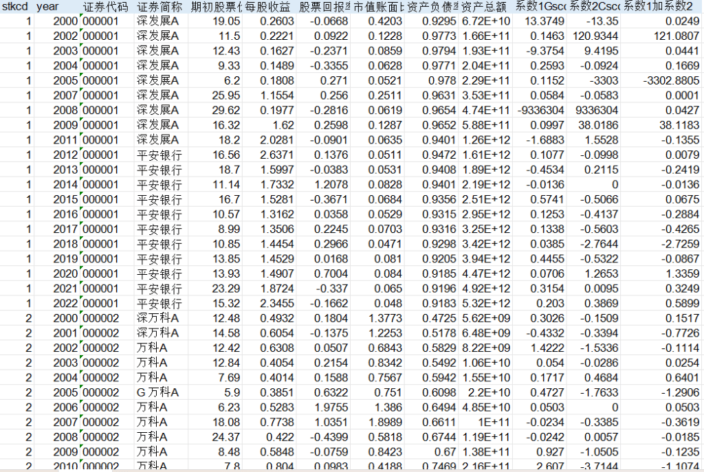 指标:stkcd、year、证券代码、证券简称、期初股票价格、每股收益、股票回报率、市值账面比、资产负债率、资产总额、系数1Gscore、系数2Cscore、系数1加系数2。