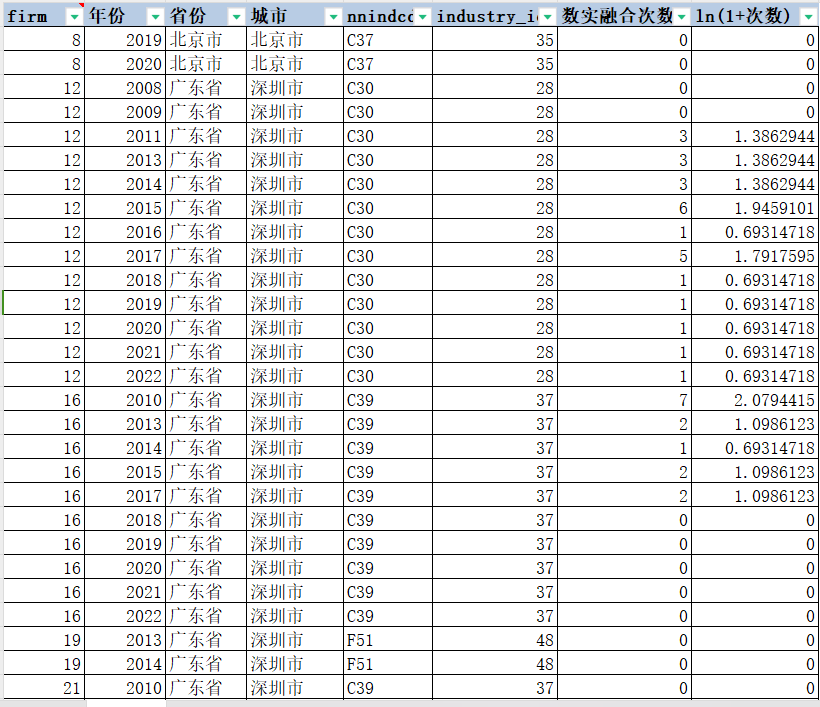 指标:firm、年份、省份、城市、nnindcd、industry_id、数实融合次数 ln(1+次数)。