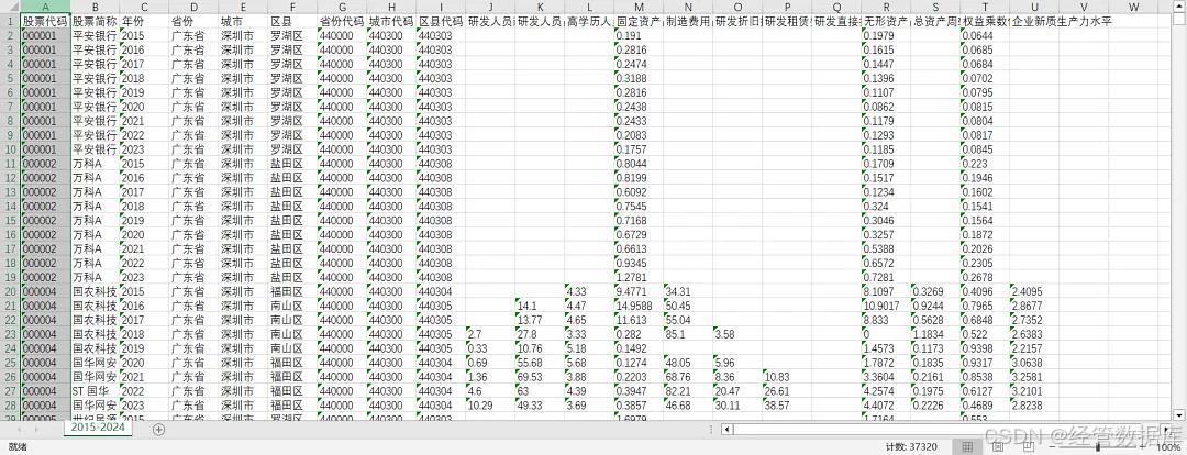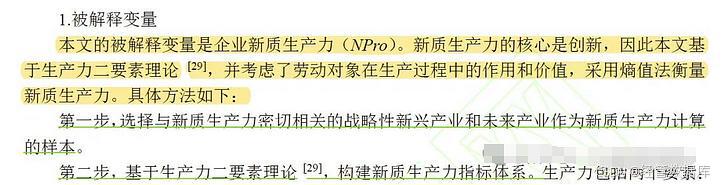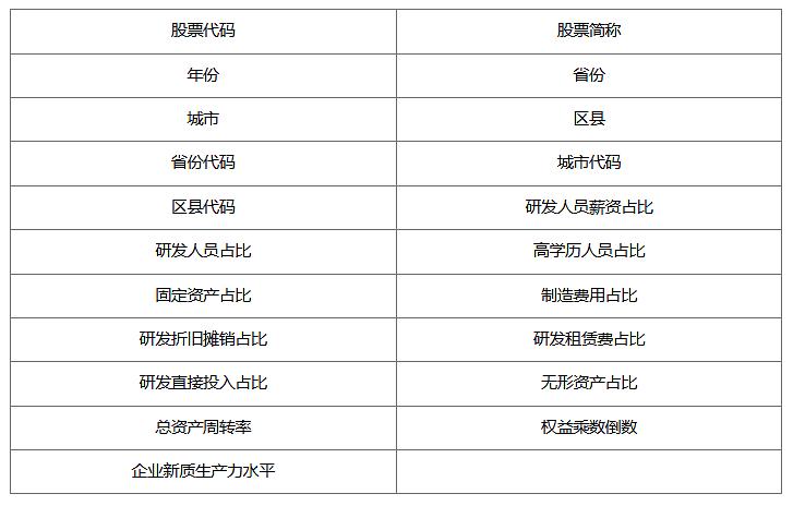 参照宋佳(2024)的做法,基于生产力二要素理论,构建新质生产力指标体系,最后利用熵值法衡量上市公司的新质生产力水平。包括原始数据、企业新质生产力水平等21个指标