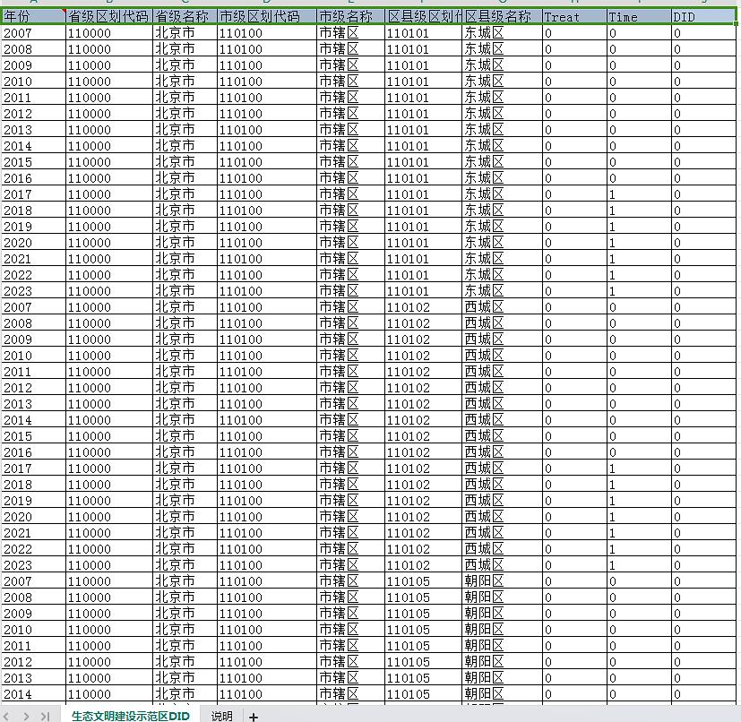 指标:年份、省级区划代码、省级名称、市级区划代码、市级名称、区县级区划代码、区县级名称、Treat、Time、DID。