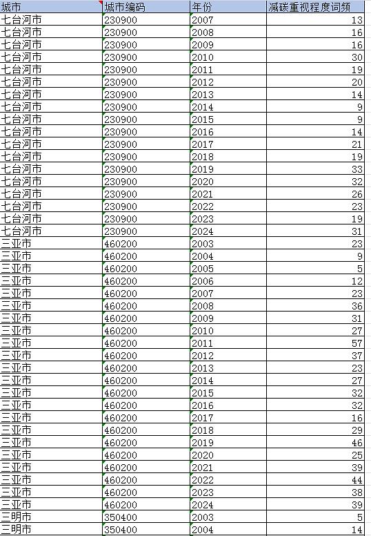 指标:城市、城市编码、年份、减碳重视程度词频。
