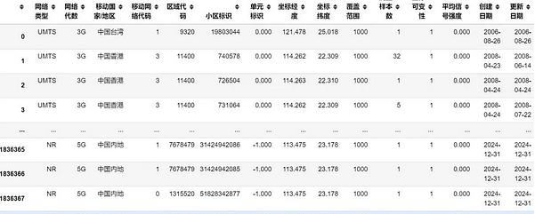 筛选得到中国的基站信息,获取中国2G、3G、4G、5G基站的原始数据。覆盖年份为2006-2024年,总计183万余条,是具有价值的研究资料