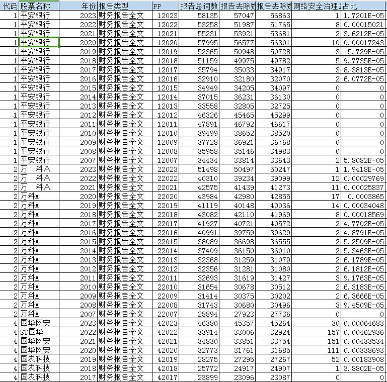 代码、股票名称、年份、报告类型、PP、报告总词数、报告去除数字后总词数、报告去除数字、英文后总词数、网络安全治理总词频、占比。