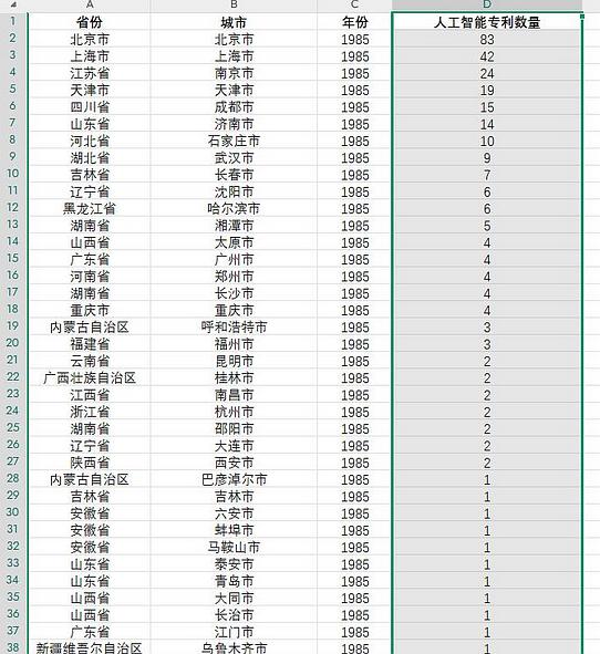 《地级市人工智能专利数据(1985 - 2024)》于 2025 年 1 月完成最新更新。数据聚焦于中国各地级市,时间跨度设定为 1985 年至 2024 年。在数据整理过程中,参照《关键数字技术专利分类体系(2023)》,依据其中 “人工智能” 类技术的专利分类号,结合国家知识产权局所提供的信息,对各地每年的专利申请展开搜索与匹配。在此基础上,从众多专利申请中精准筛选出属于 “人工智能” 类别的专利,并进行数量统计,数据涵盖全国334个地级市。
