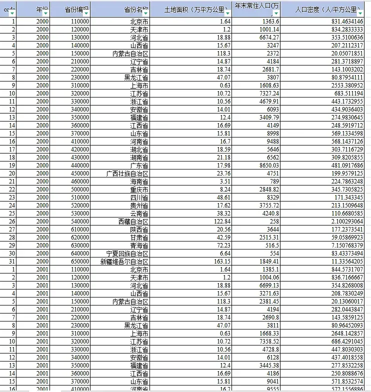 指标:code、年份、省份编码、省份名称、土地面积(万平方公里)、年末常住人口(万人)、人口密度(人/平方公里)。