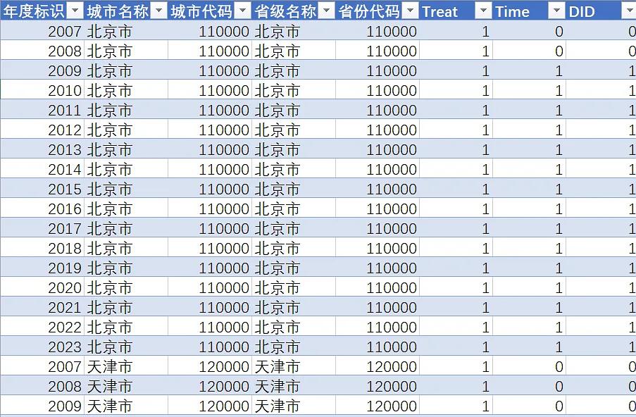 年度标识、城市名称、城市代码、省级名称、省级代码、Treat、Time、DID