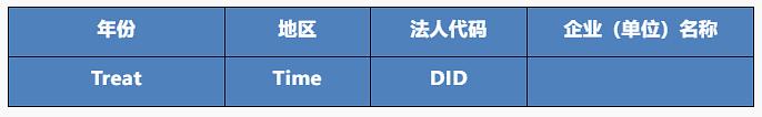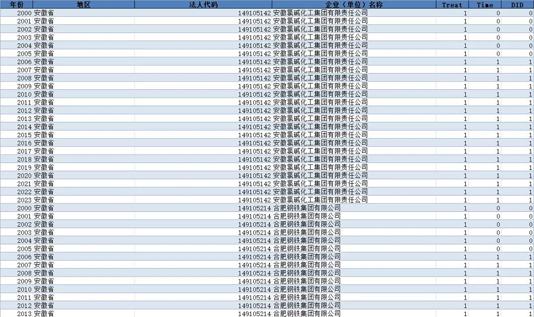 若样本公司为参与单位,则Treat变量赋值为 1,否则为 0;Post为年份虚拟变量,在数据中为Time,在2006年及之后取1,非参与单位的Time均赋值为0。因此,政策虚拟变量(Treat×Post)表征在数据中为DID,表示单位 在第 年是否参与千家企业节能行动。需要说明的是,为了方便大家使用与研究,我们将数据的年份范围扩充至2000年到2023年,并非采用原做法中的2001到2011年。