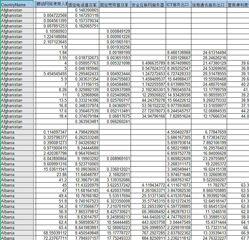 国家名称 年份 国家代码 移动网络使用人数 固定电话普及率 固定宽带普及率 安全互联网服务器(每百万人) ICT服务出口 信息通讯服务出口 营商便利度评分 创业便利度评分 科技期刊文章 研发支出占GDP比重 高等教育劳动力占比 高等教育入学率 ICT前沿技术准备度 最新技术可获得度 政府决策透明度 电信服务收入美元 移动网络收入美元 风险资本可获得性 ICT相关论文发表量 教育支出总额占比 政府效率 物流绩效指数 移动蜂窝订阅量(每100人)