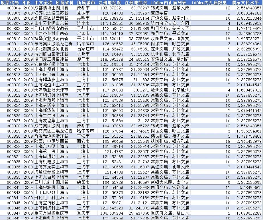 上市公司儒家文化水平数据集,从上市公司年报中拿到每年的上市公司信息,参考窦军生在经济管理发表的儒家文化测试方法,计算在上市公司注册地周围100公里内的孔庙遗存数量并+1取其自然对数,整理成面板数据,方便大家研究使用。