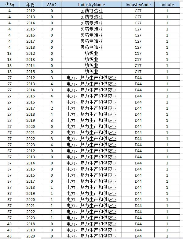 代码、年份、GSA2、IndustryName、IndustryCode、pollute