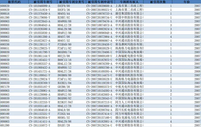 股票代码、被引用专利号、被引用专利分类号、被引用专利申请号、专利所有权人、被引用次数、年份