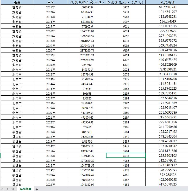 省份、年份、光缆线路长度(公里)、年末常住人口(万人)、光缆密度。