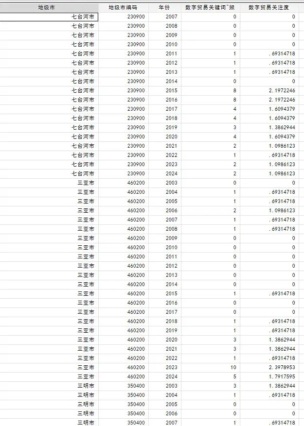 指标:地级市名称、地级市编码、年份、数字、数字贸易关键词总词频(数字贸易 电子商务 跨境电商 网上交易 网上零售 网上购物 在线支付 移动支付 第三方支付 B2B B2C C2B O2O)、数字贸易关注度。