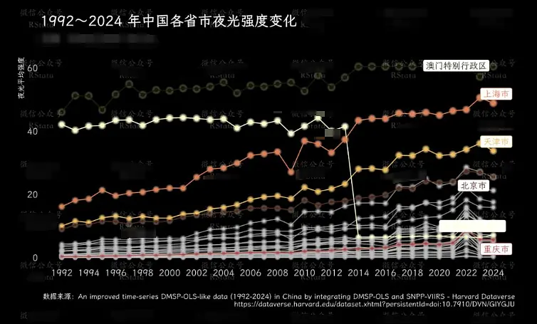 由于这份数据是根据 DMSP-OLS 和 SNPP-VIIRS 整合得到的,所以我们再检查下数据的连续性,1992~2024 年中国各省市夜光强度变化趋势如下: