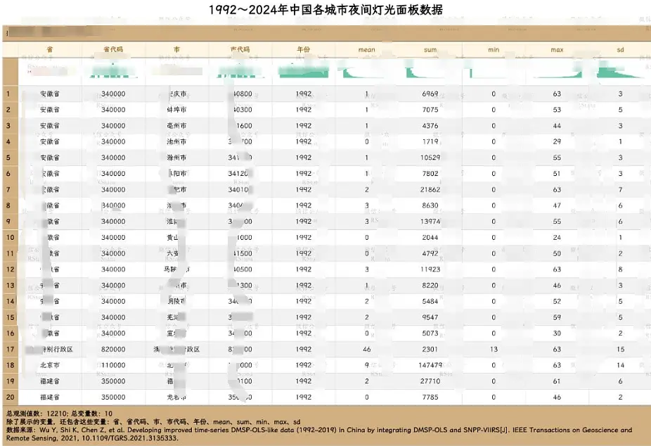 今天给大家分享一份 1992~2024 年中国各省市区县乡镇类 DMSP-OLS 夜间灯光面板数据。