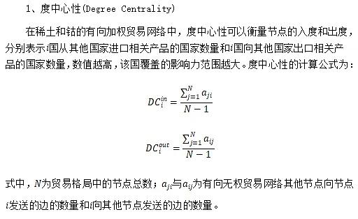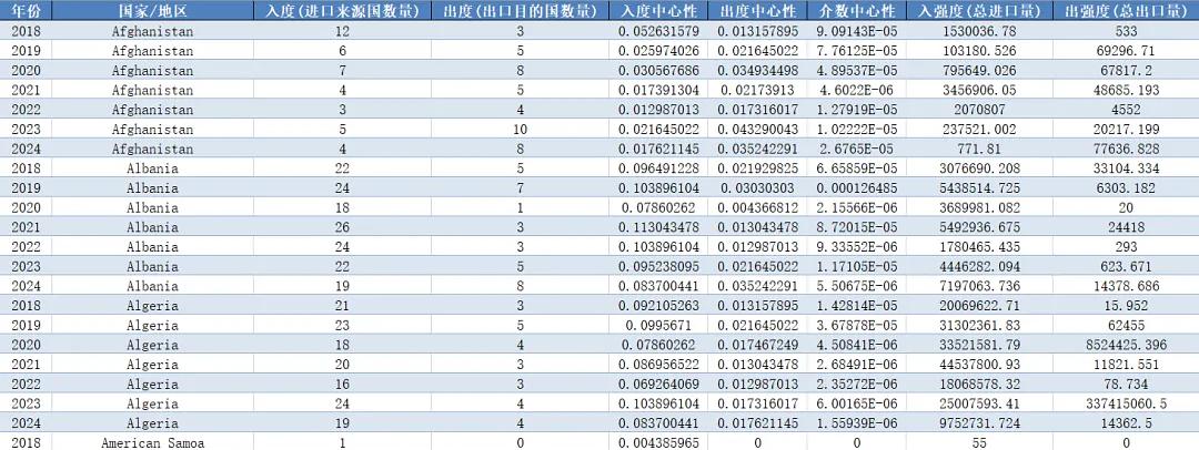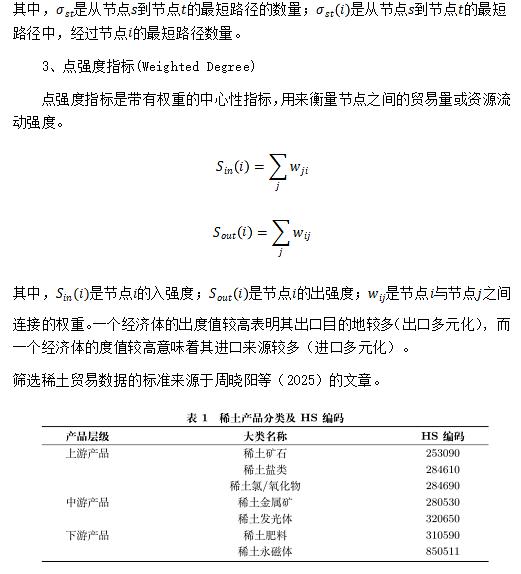 受美国贸易保护主义的影响,全球稀土贸易格局发生了剧烈的变化,因此本团队收集了从2018年第一次中美关税战开始的稀土贸易数据并构建贸易网络,通过三个网络指标(度中心性、介数中心性、点强度)共同揭示了各个国家或地区(下面简称国家)在全球战略性矿产贸易网络中的结构性地位与影响力。度中心性衡量节点(国家)的直接连接数量,反映贸易关系的广度。入度表示进口来源国的数量,体现供应渠道的多元化程度;出度表示出口目的国的数量,体现市场覆盖范围。介数中心性表征节点控制资源流转的能力。数值越高,说明该国在贸易路径中担任“枢纽”角色,对资源流动的掌控力越强。点强度结合贸易权重(如进出口额),量化实际贸易规模。入强度体现资源进口依赖度(如中国钴上游进口额高);出强度反映出口主导力(如刚果(金)钴上游出口额领先)。该指标揭示贸易量级差异,比单纯连接数更精准刻画节点影响力。本团队参考周晓阳、徐衍爽、李泽煜、吴迪、汪寿阳(2025)的文章,按照如下步骤得出三种稀土网络指标: