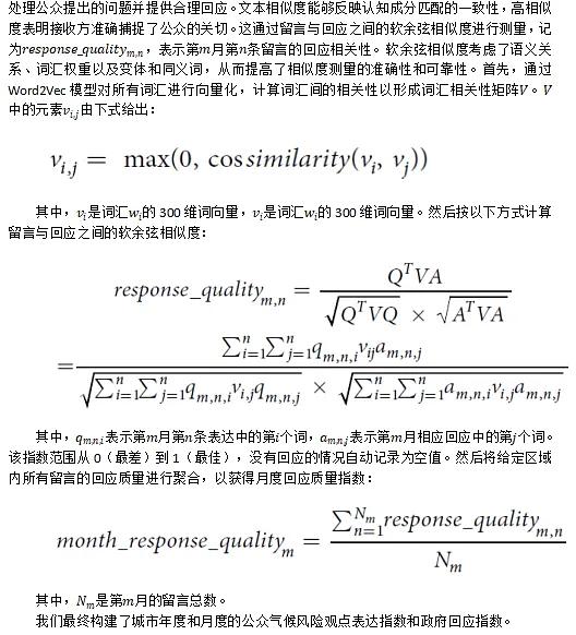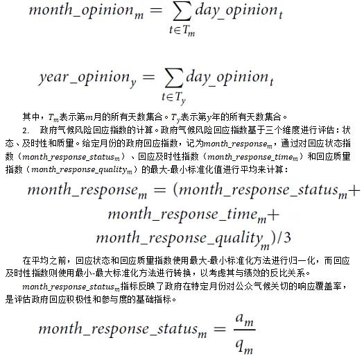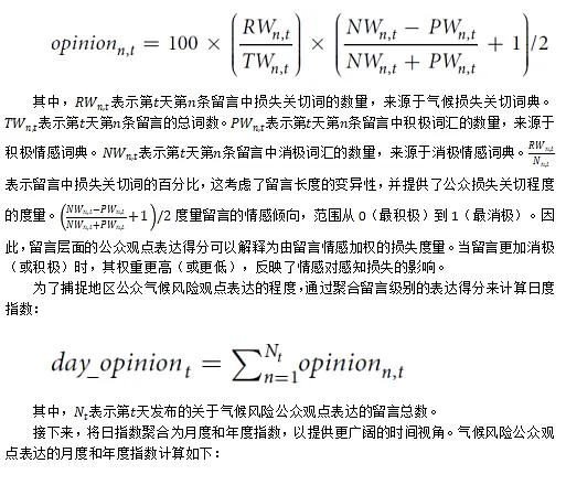 1.公众气候风险观点表达指数的计算。公众气候风险观点表达指数基于每个区域表达中包含的潜在损失描述来构建。首先,每条文本的公众观点表达情况指数expressionsn,t按以下公式计算: