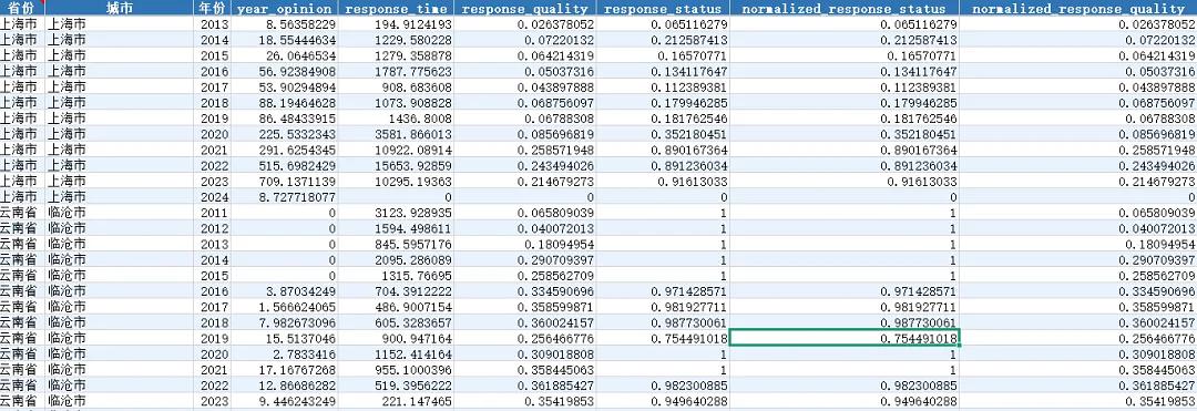 面板数据字段说明:该面板数据集包含完整的行政区划标识体系,其中year_opinion为年度公众气候风险观点表达指数,month_opinion为月度公众气候风险观点表达指数,response_quality为回应质量,response_status为政府对气候相关表达的回应比例,response_time为政府回应每条留言的时间,normalized_response_status、normalized_response_quality、normalized_response_timeliness分别为根据论文计算的标准化结果,government_response_index为政府回应指数。