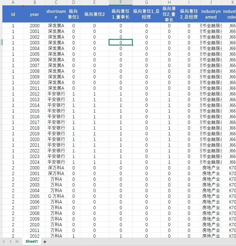 纵向兼任变量共有六种由你选择: 纵向兼任1:董事长/总经理在大股东单位兼职则赋值为1,否则为0 纵向兼任2:董事长/总经理在控股股东或直接控制人兼职则赋值为1,否则为0 纵向兼任1_董事长:董事长在大股东单位兼职则赋值为1,否则为0 纵向兼任1_总经理:总经理在大股东单位兼职则赋值为1,否则为0 纵向兼任2_董事长:董事长在控股股东或直接控制人兼职则赋值为1,否则为0 纵向兼任2_总经理:总经理在控股股东或直接控制人兼职则赋值为1,否则为0