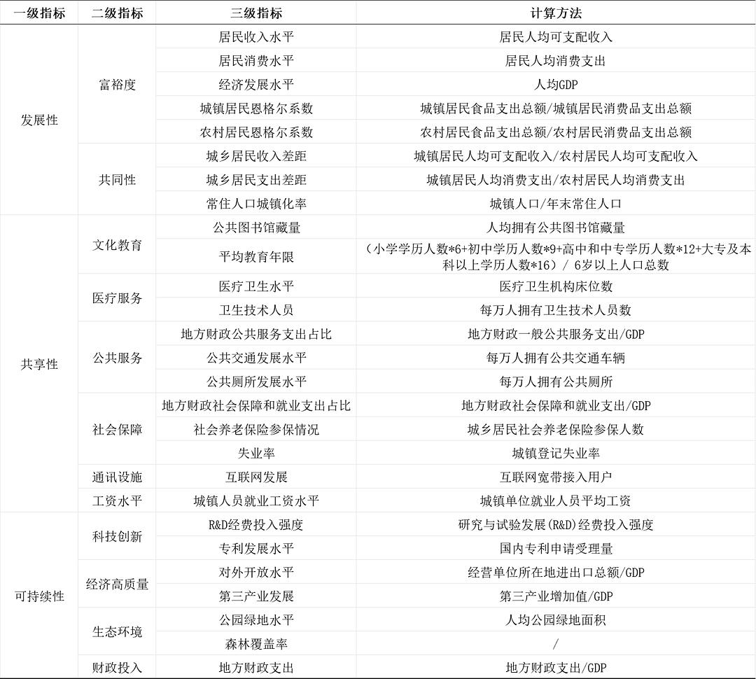 借鉴《软科学》韩亮亮等(2023)的研究方法,基于发展性、共享性和可持续性三个维度构建共同富裕评价体系,并结合省际数据的可得性,科学选取关键指标,构成三级指标结构,然后采用熵值法进行赋权,避免主观性干扰与指标重复,提高评价的客观性和精度。指标体系如下: