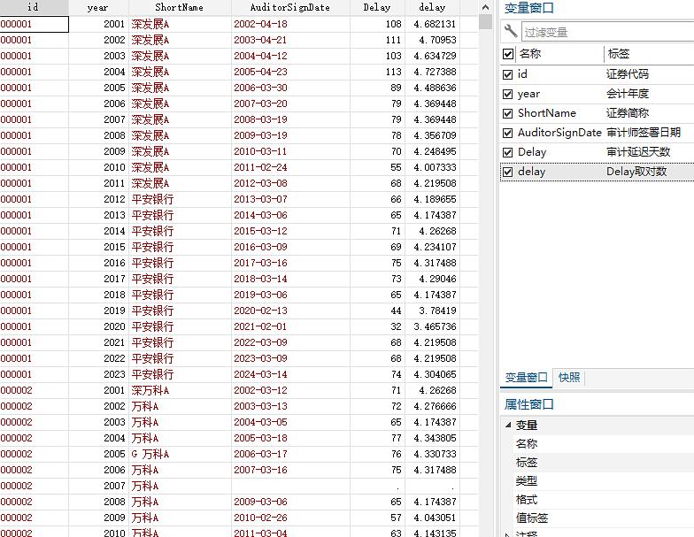 证券代码、会计年度、证券简称、审计师签署日期、审计延迟天数、Delay取对数