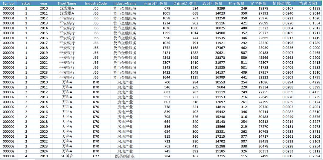 本数据收集了4815家上市公司2010-2024年的年报文本,并基于自然语言处理技术提取情感词汇,最终得到5w+涵盖正负面词汇数量、句子数、总词汇数等多项指标的情感语调数据