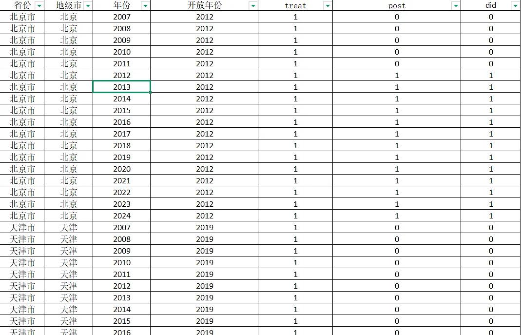 省份、地级市、年份、开放年份、treat、post、did