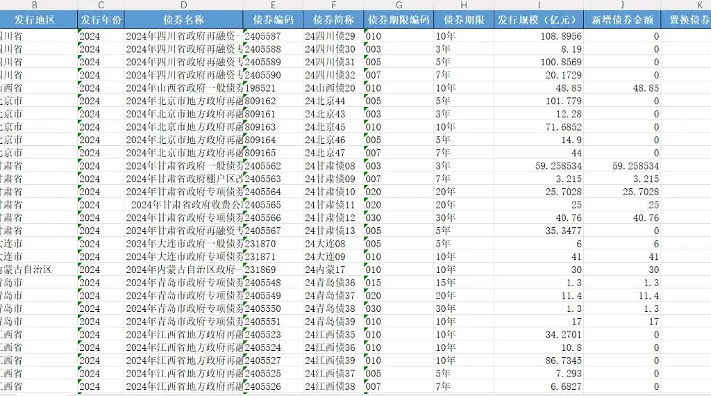 指标:发行地区代码 发行地区 发行年份 债券名称 债券编码 债券简称 债券期限编码 债券期限 发行规模(亿元) 新增债券金额 置换债券金额 再融资债券金额 起息日 债券类型编码 债券类型 利率(%) 债券发行时间 付息方式代码 付息方式 赎回模式 到期日
