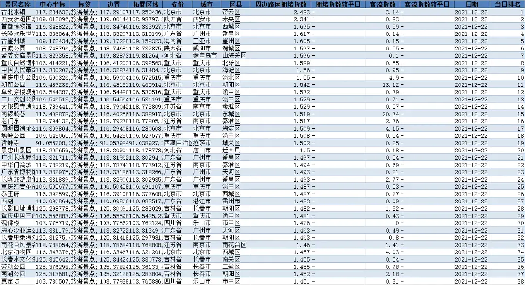 本数据集涵盖2021年12月至2025年2月中国重点旅游景区周边路网的拥堵情况及客流变化情况,数据来源于百度地图交通出行大数据平台。数据通过每日筛选全国范围内周边路网拥堵指数排名前100的景点,记录各景区的拥堵指数、客流指数及其相较于平日的变化情况,同时包含详细的地理信息,如景区名称、中心坐标、所属省市及区县等。这些数据能够全面反映热门景区在不同时间段的交通和人流压力,为旅游管理部门、城市规划者及相关研究人员提供精准的数据支撑。 该数据集的研究意义在于,通过对全国重点旅游景区交通拥堵和客流指数的长期监测,可以揭示假期、季节变化及其他社会经济因素对景区交通和游客流动的影响。这不仅有助于政府和景区管理方优化交通管理、提升旅游体验,还能为旅游行业提供趋势分析,助力智慧旅游的推进。此外,该数据还能用于研究城市交通与旅游活动之间的相互作用,为未来的基础设施建设和政策制定提供参考。