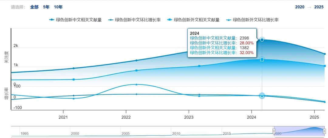 在全球可持续发展的宏大命题下,绿色创新宛如一束穿透迷雾的强光,照亮着人类破解“发展与生态”悖论的探索之路。近五载(2020-2024)间,学术领域的关注浪潮持续翻涌:中文文献量如破土青竹节节攀升,2024年突破2398篇大关,28%的环比增速恰似学者们争逐“绿色密码”的铿锵脚步;外文研究亦如跨洋浪潮奔涌而来,1382篇成果与32%的增长曲线,勾勒出国际学界对“可持续创新范式”的集体叩问。那些或扬或抑的增长率折线,不仅是数据的律动,更是无数研究者在实验室、田野与书桌前,为“让创新扎根生态土壤”而燃烧的求知火焰——每一次文献量的跃升,都藏着对“产业如何减碳”的思辨;每一个增长率的波动,都映照着“政策怎样赋能”的探索。当东西方智慧在这个领域交织共振,这场学术热潮早已超越了论文计数本身,成为撬动全球绿色转型的知识杠杆,托举着人类迈向与自然共生的未来。