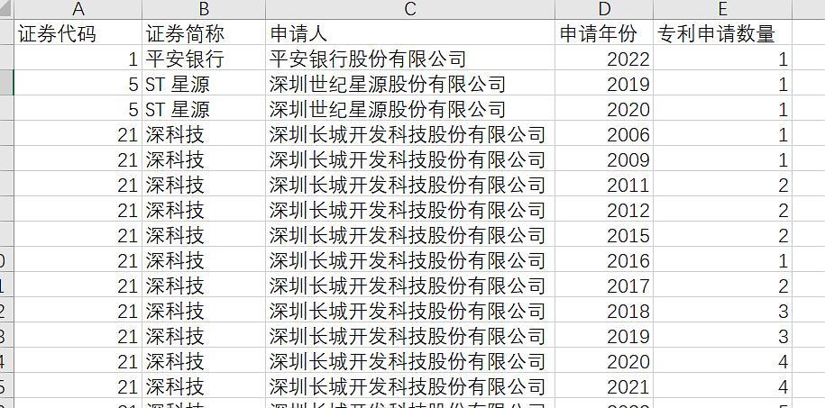 证券代码、证券简称、申请人、申请年份、专利申请数量
