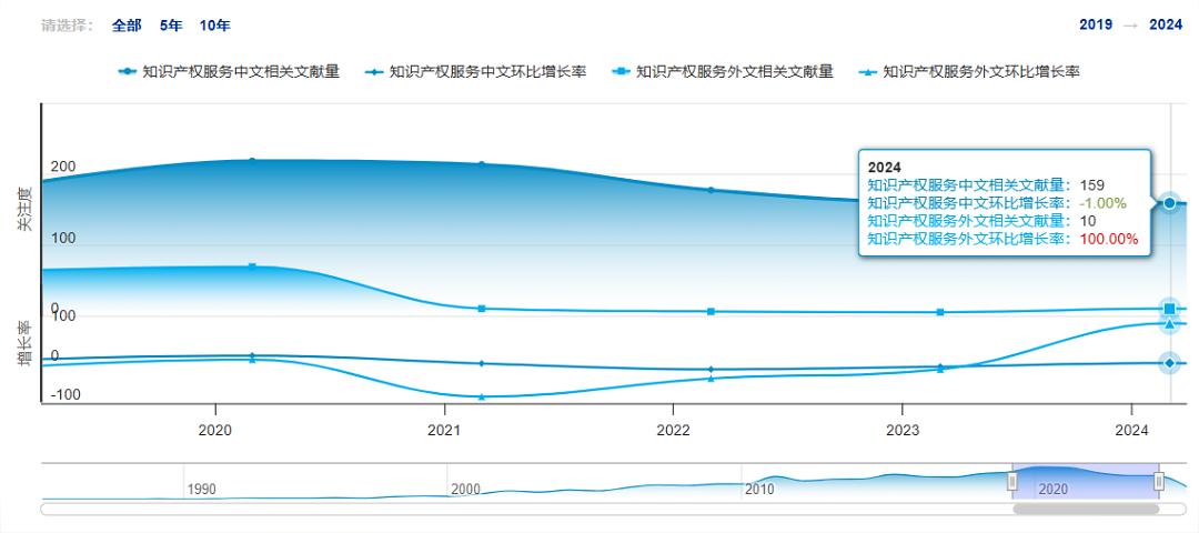 2019-2024年,知识产权服务的学术研究持续受到关注。从中文相关文献量来看,近几年的研究数量虽有所降低,但2024年仍高达159篇,长期以来,这些文献为国内学者开展知识产权服务、专利代理、企业创新等相关研究提供了重要的理论支撑与交流载体。在外文相关文献方面,2024年有10篇,同比增长100.00%,体现出全球范围内对知识产权服务的研究热度也在不断提升,国际学者通过文献分享不同的经验与成果,推动该领域研究突破地域局限,实现全球范围内的交流与拓展。