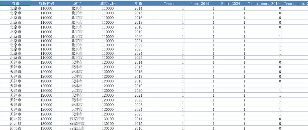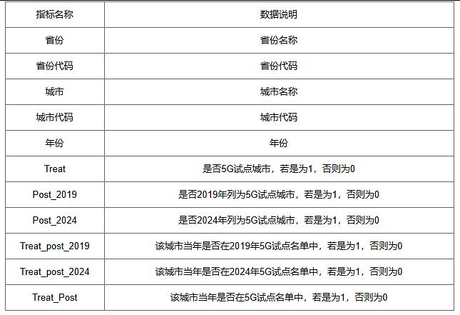 本数据基于2019年、2024年两个试点时间构建地级市5G试点城市DID数据,包含Treat、Post_2019、Post_2024、Treat_post_2019、Treat_post_2024等指标,该数据旨在帮助研究者系统化评估5G政策试点的实施效果及对城市数字化转型的推动作用