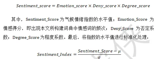 本数据选取国内三大最具权威性与影响力的主流媒体作为数据来源, 《人民日报》《光明日报》《经济日报》, 获得了 2013 年 1 月 1 日至 2022 年 12 月 31 日期间的新闻文本数据. 为从全部样本中筛选出与气候变化相关的文本, 需要确定一组搜索关键词. 本数据选取参考文献中确定的关键词“气候变化” “全球变暖” “碳排放” “温室效应” “新能源” “太阳能” “碳汇” “节能” “减排” “污染” “温室气体”从全部文本中筛选含有以上任一关键词的文章。然后本数据首先以获取的气候变化新闻文本作为语料库, 运用词频-逆文档频率 (TF-IDF) 和 TextRaor 算法选择种子词, 进行气候情绪词典构建。得到种子词后, 加入姜富伟等 构建的中文金融情感词典, 用于情感判断。同时人工补充影响气候情绪的政治性词语和灾害类词语 , 构建形成最终的气候情绪词典. 本数据将词典中的词语积极赋值为 1, 消极赋值为-1, 以便后续计算情感得分. 在计算得分时, 引入《知网 Hoeoet》情感分析用词语集中的否定词典和程度词典, 使文本情绪更加精准。首先,对得到的气候变化文本进行清洗处理,去除无效字符、链接等,并只保留每月文本数据中包含关键词的语句。其次,加入知网词典中的程度副词否定词,使用考虑句法结构的气候情绪指标构建方法,即只量化匹配到主题词的句子,出现程度词进行成倍的加强或减弱,出现否定词则计算否定系数(奇数个为-1,偶数个为+1),将新闻中所有句子的得分加总得到当日指数,月度指数取平均值。具体计算公式如下: